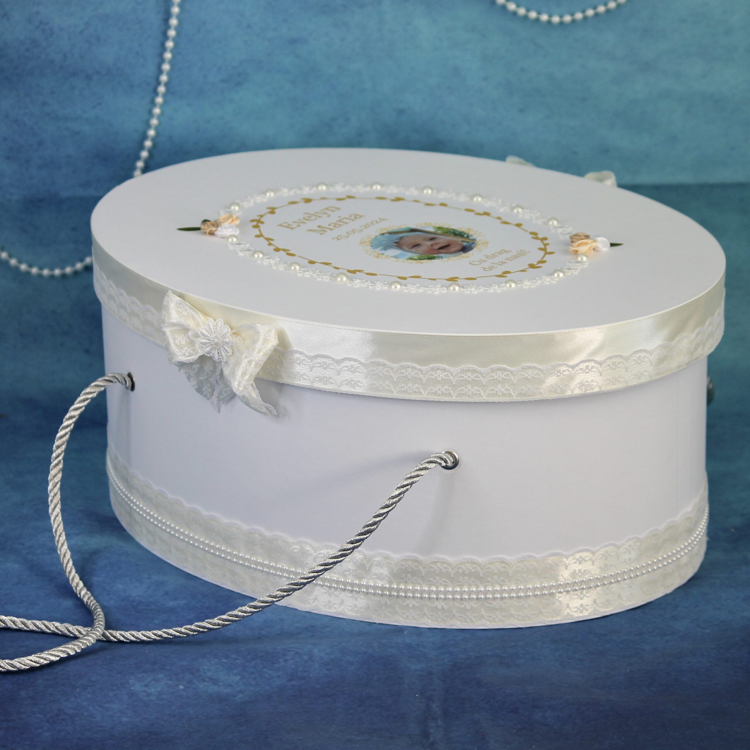 Cufărul este decorat handmade cu perluțe, dantelă ușoară, panglică și flori din satin și personalizare cu poza, numele și mesajul „Cu drag de la nași„. Se poate ridica ușor datorită șnurului din părțile laterale.