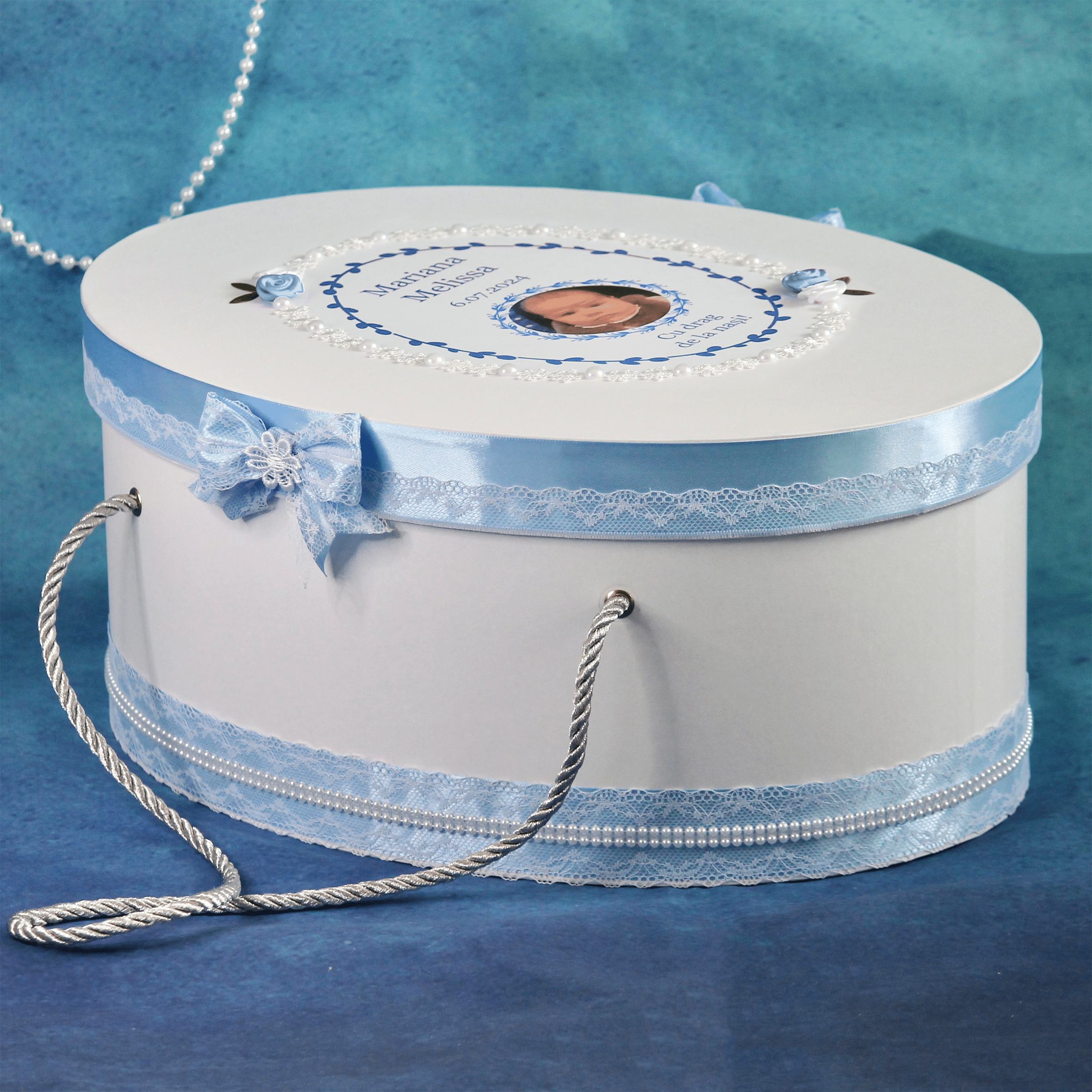 Cufăr Botez Oval Personalizat Bleu Fundițe