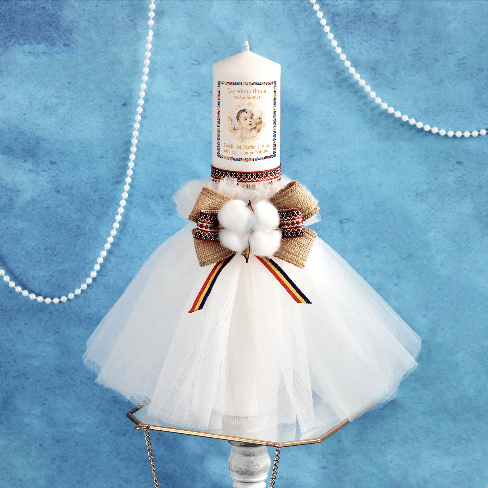 Lumânare botez personalizată tull – o lumânare botez personalizată fată elegantă și deosebită, atent lucrată și creată special pentru ceremonia de botez a unei prințese delicate.