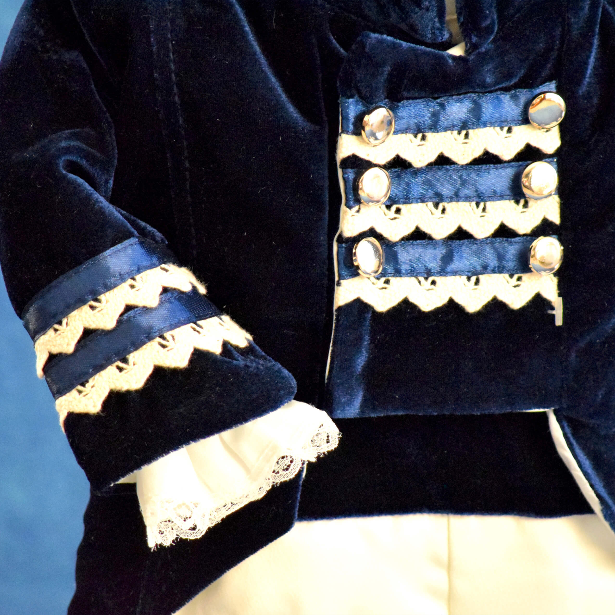 - Cămașă – este din poplin, alb-ivoire cu mâneci crețe și dantelă, manșetele cămășii se ivesc de sub mânecile catifelate ale redingotei.