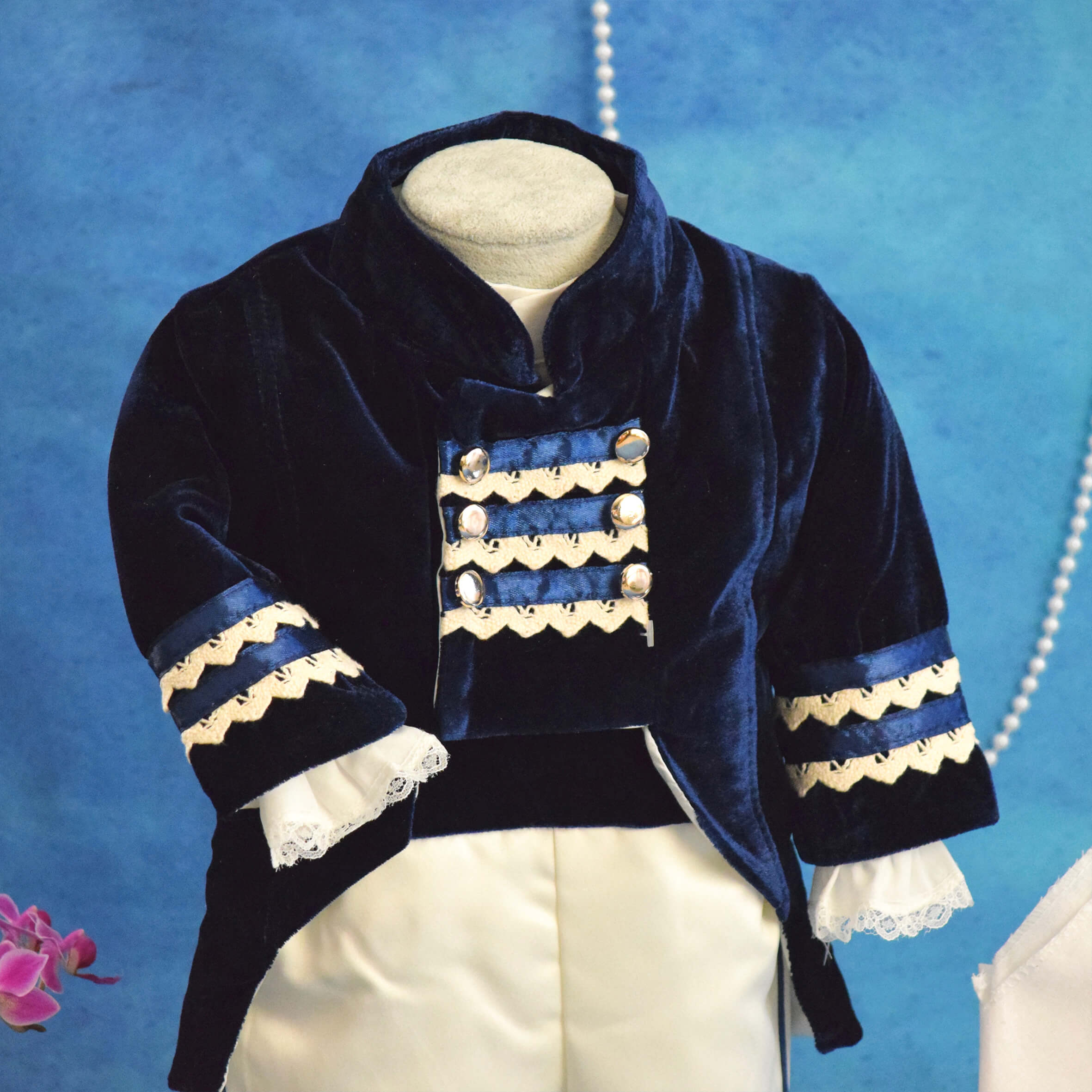 - Sacou – este din catifea, tip tunică, cambrată, evazată, închisă până sub gât și cu șliț la spate. Pe piept se găsesc detalii de dantelă, bandă satin și nasturi aurii.