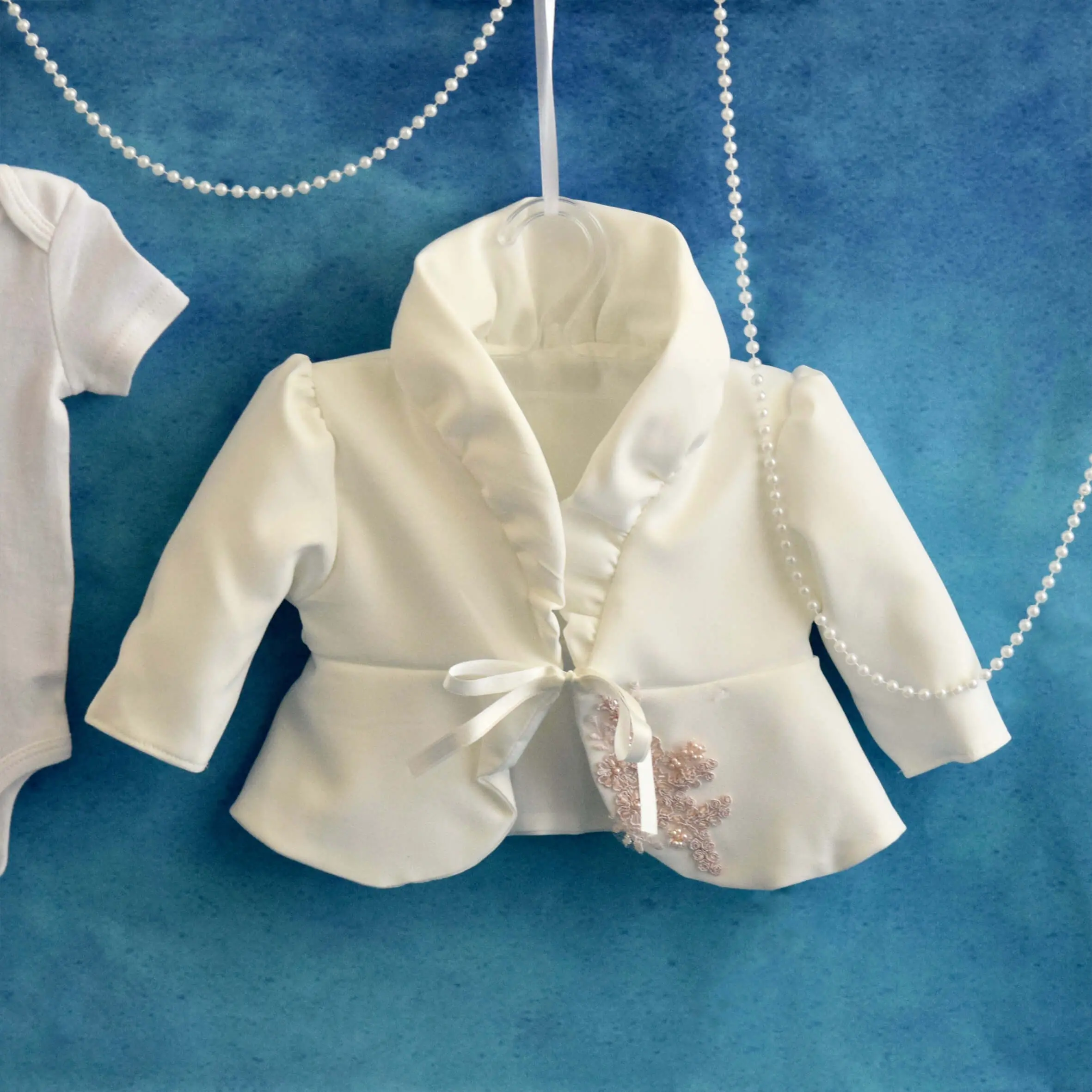 - Bolero – are căptușeală și este accesorizat cu broderie asemanatoare rochitei. Boleroul completează rochița perfect, un adaos elegant pentru vremea mai puțin favorabilă.