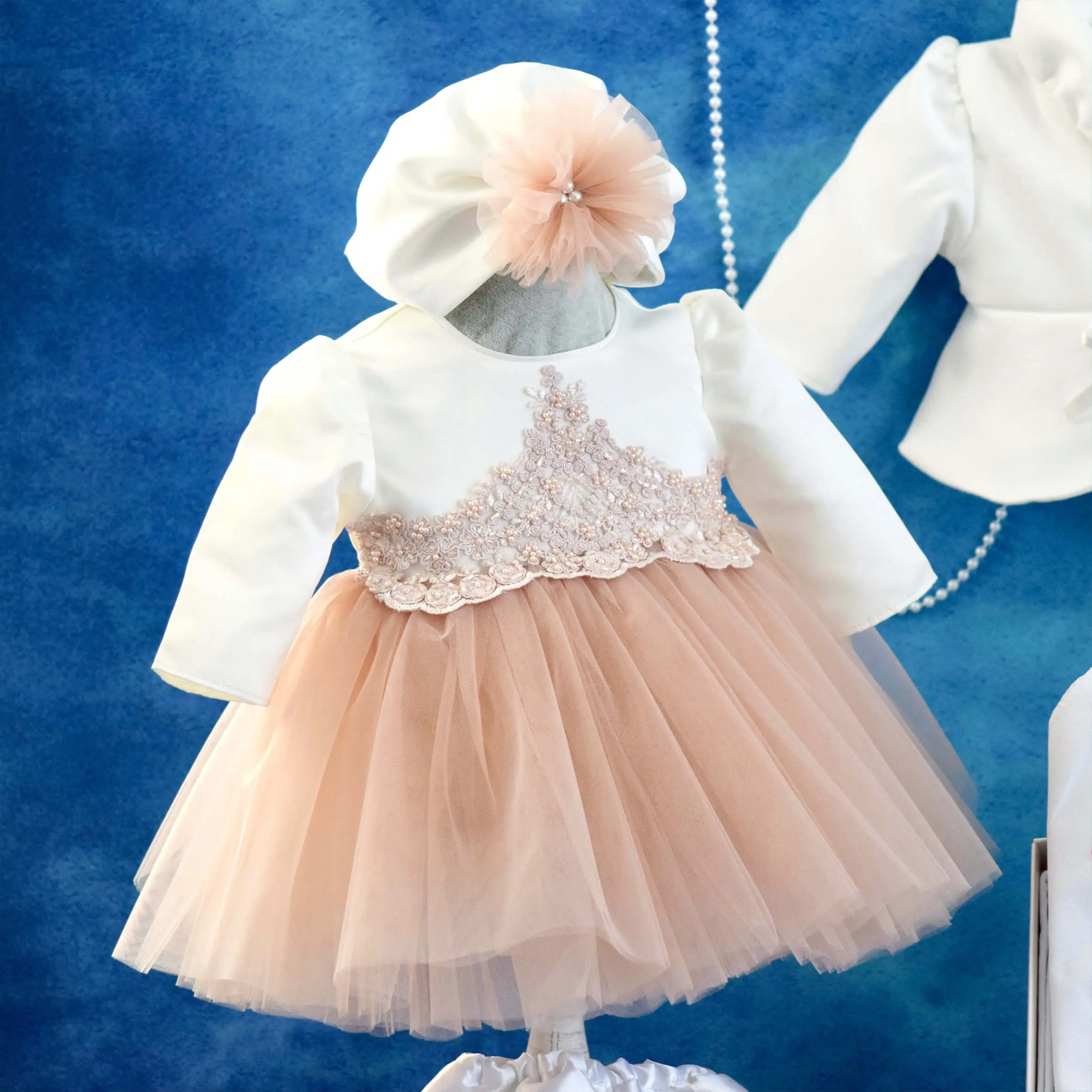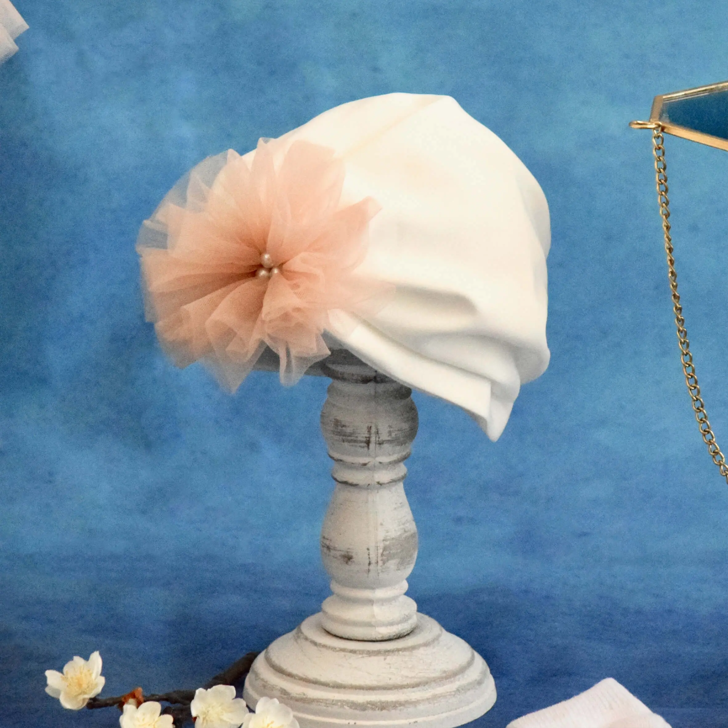 - Turban – este din același material ca boleroul, un tricot fin. Are detaliu un pampon creț din tull și perluță.