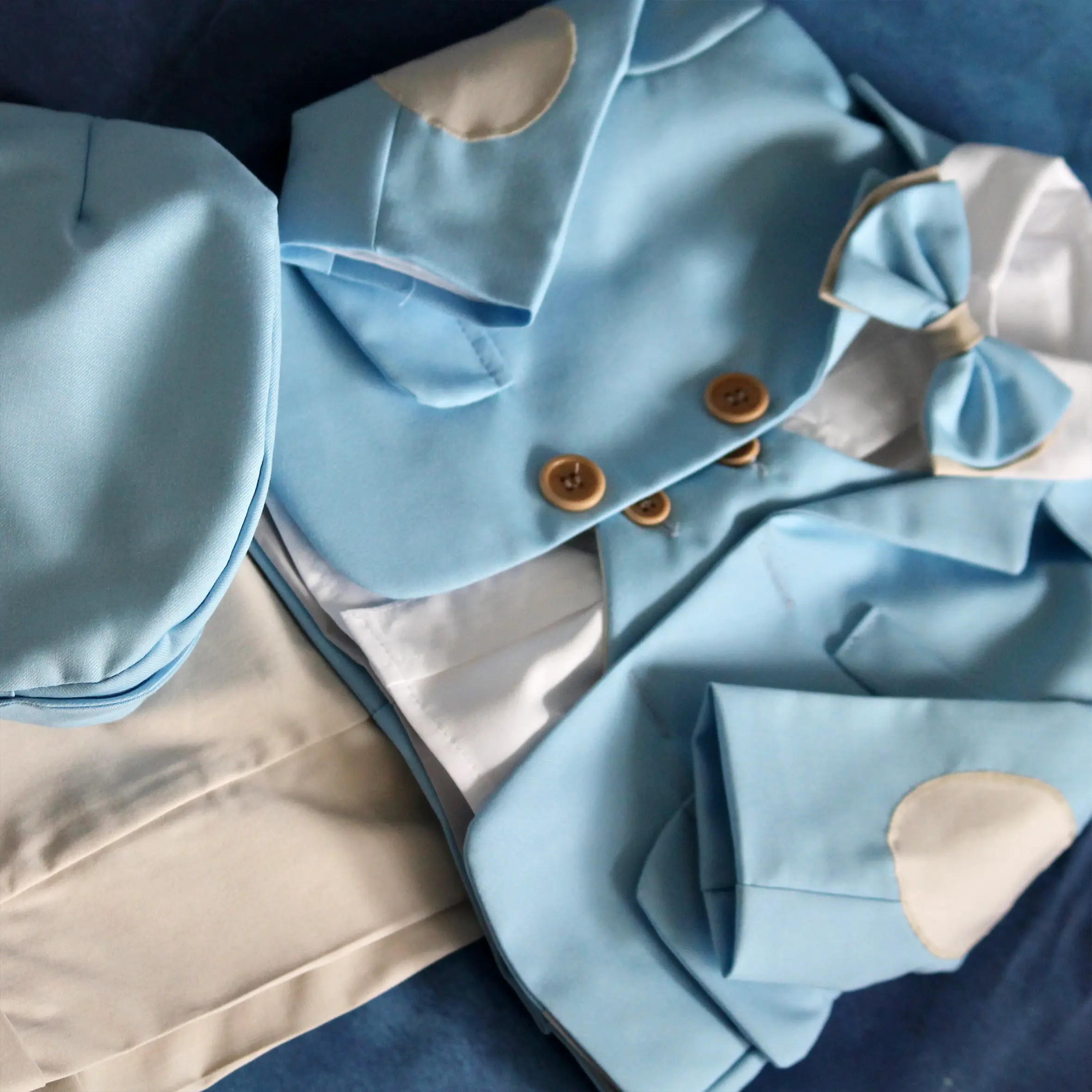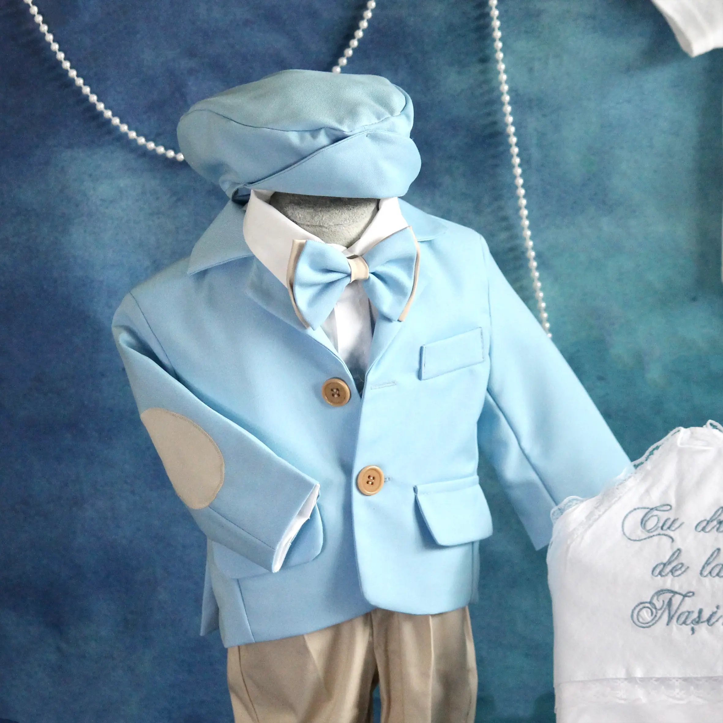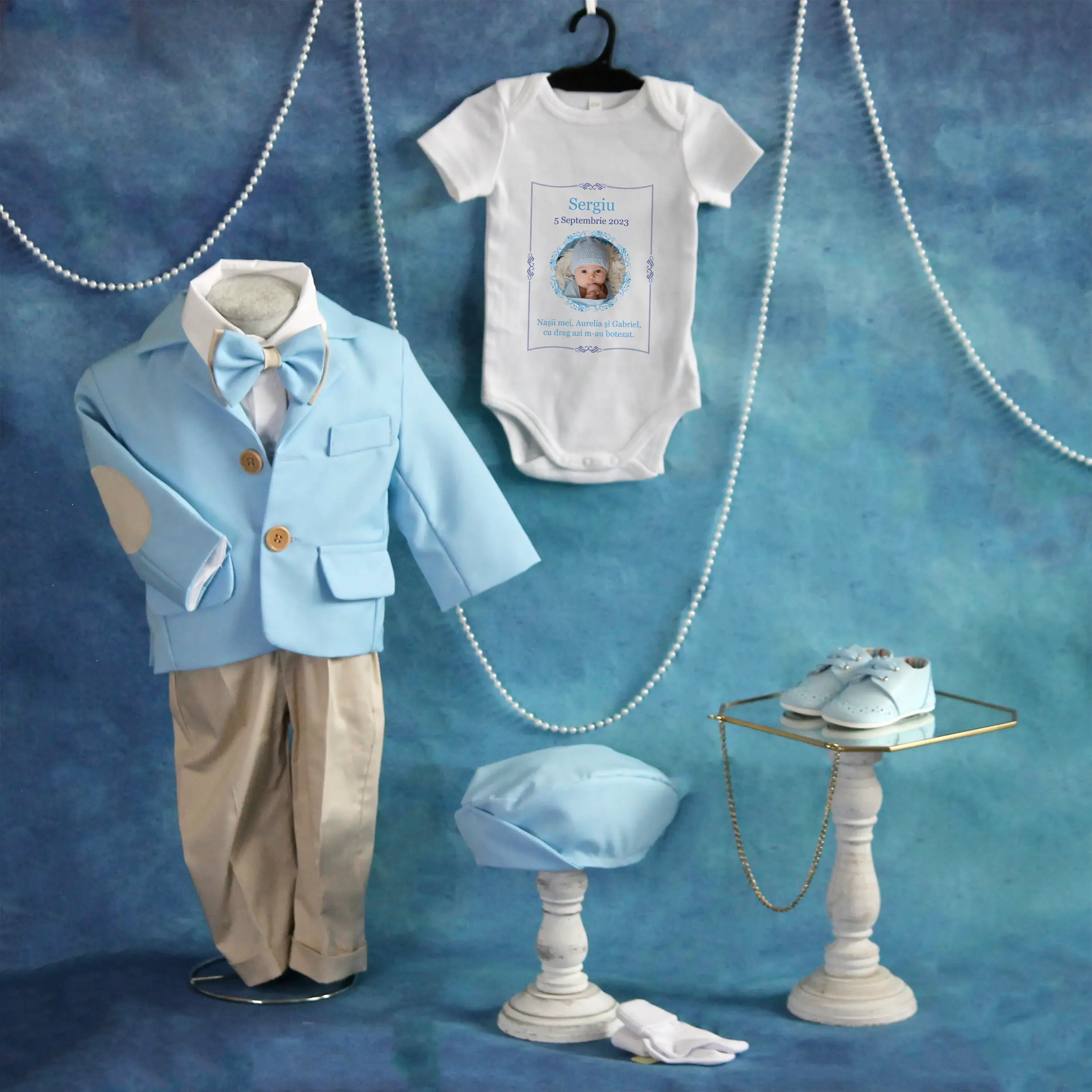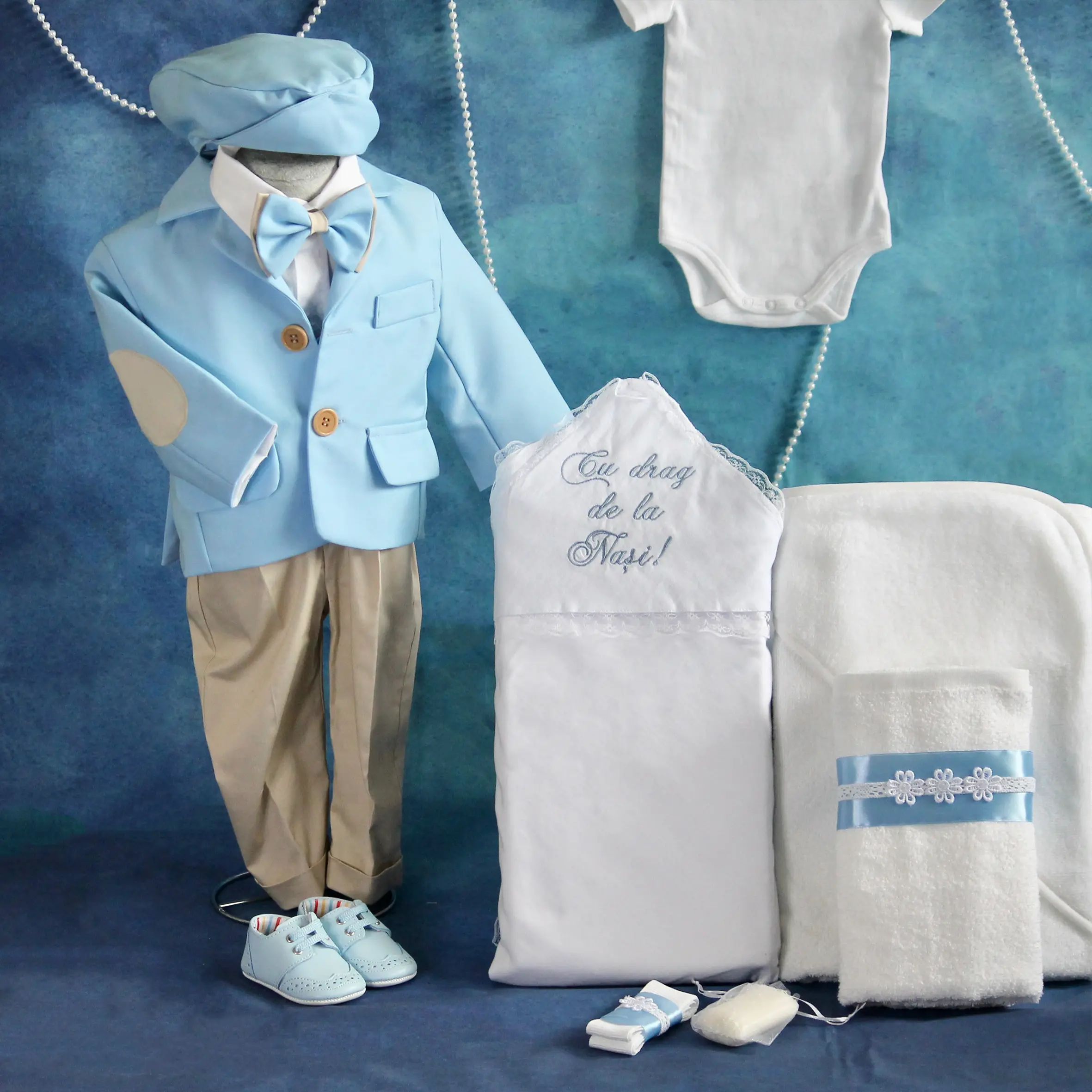 Set complet de botez Gabriel Bleu 16 piese. Costum: sacou, cămașă, pantaloni, șepcuță, papion, botosei, șosete, body. Lumanare și Trusou personalizate.