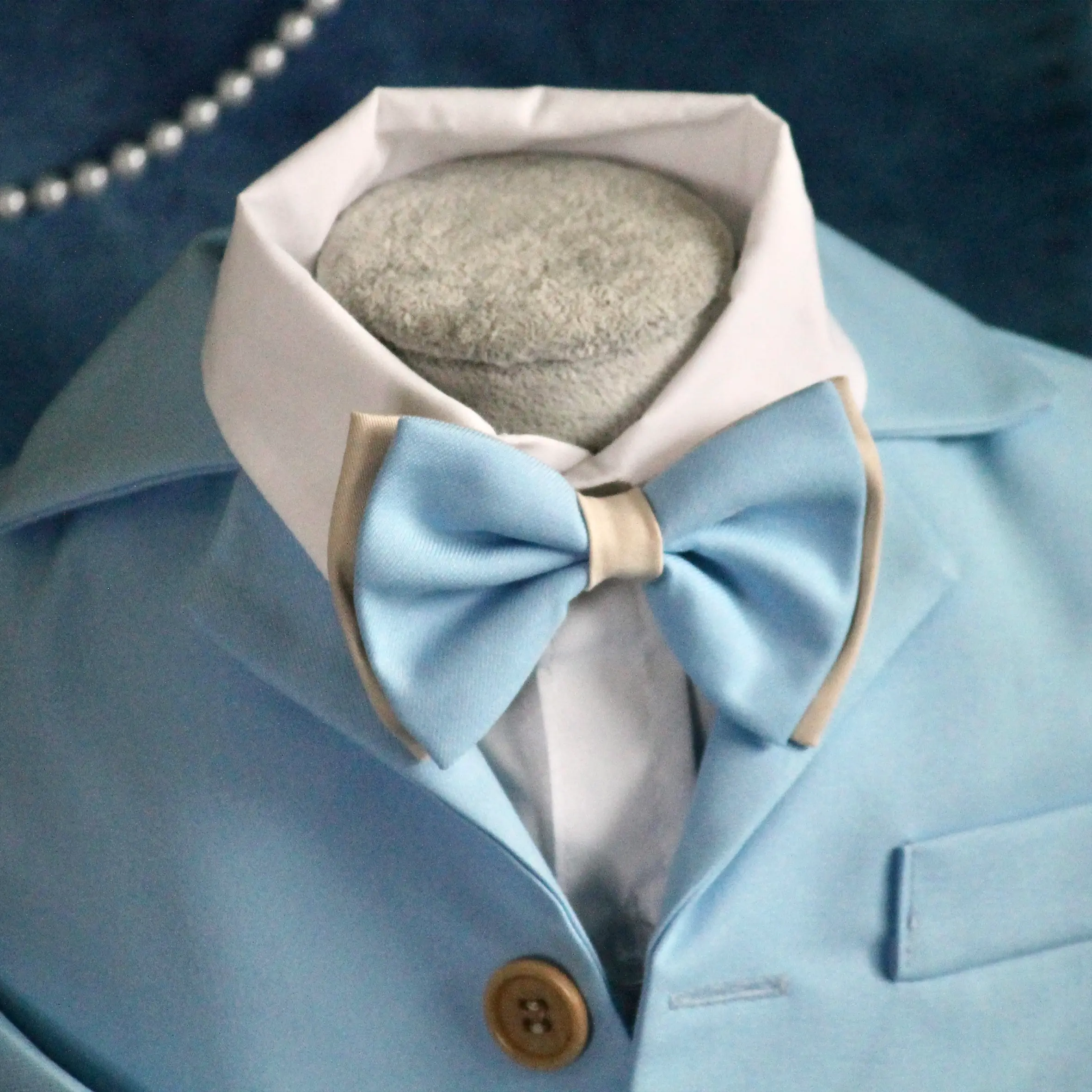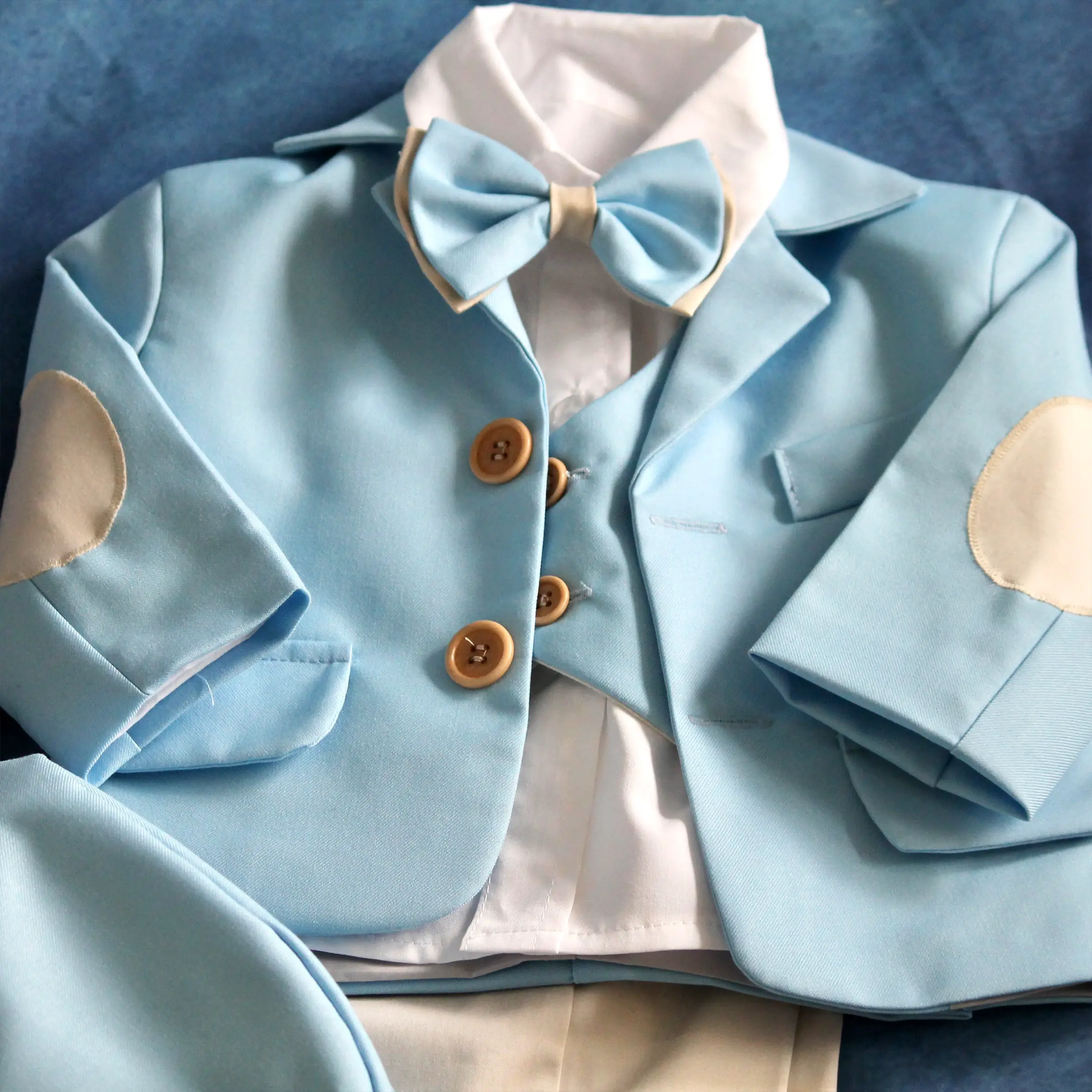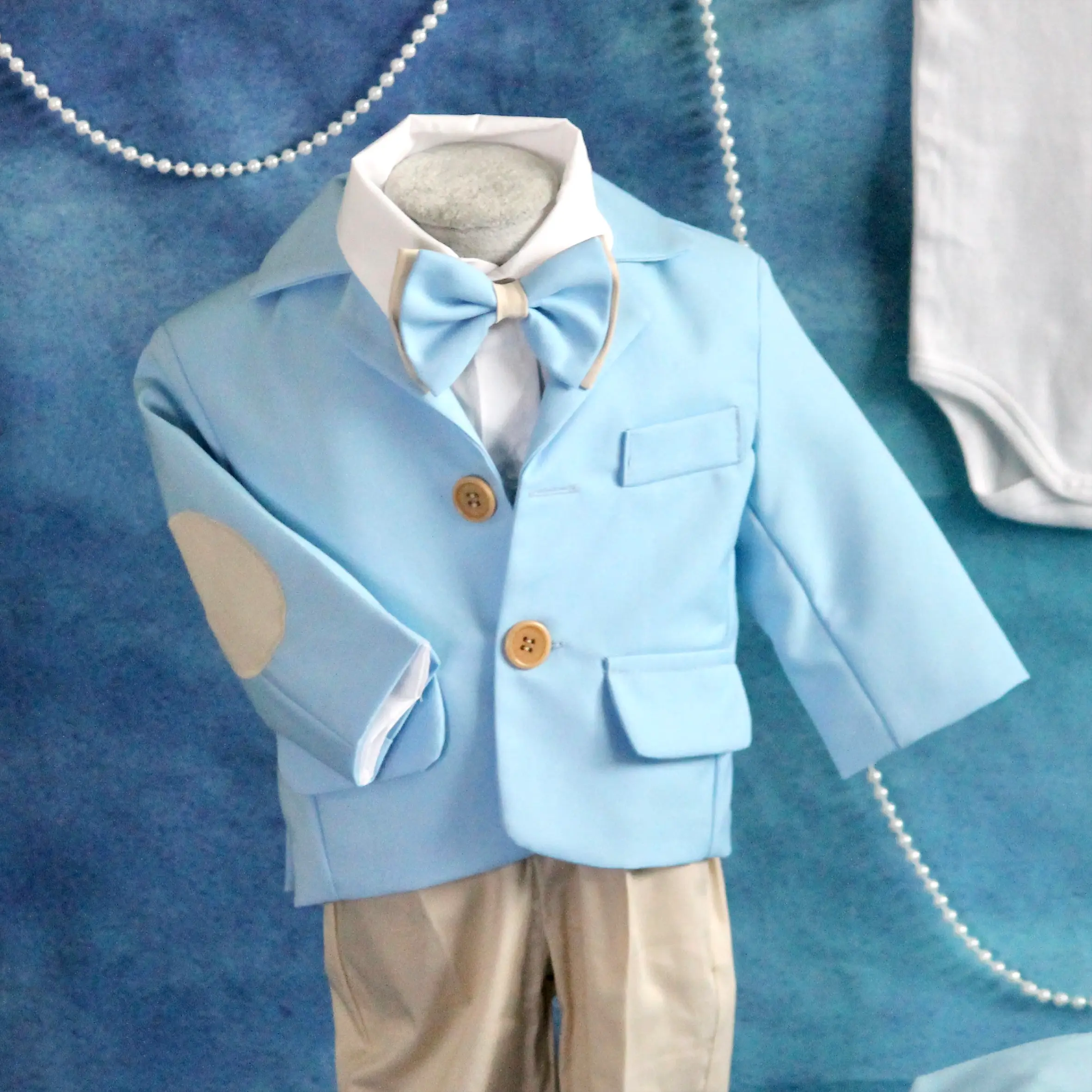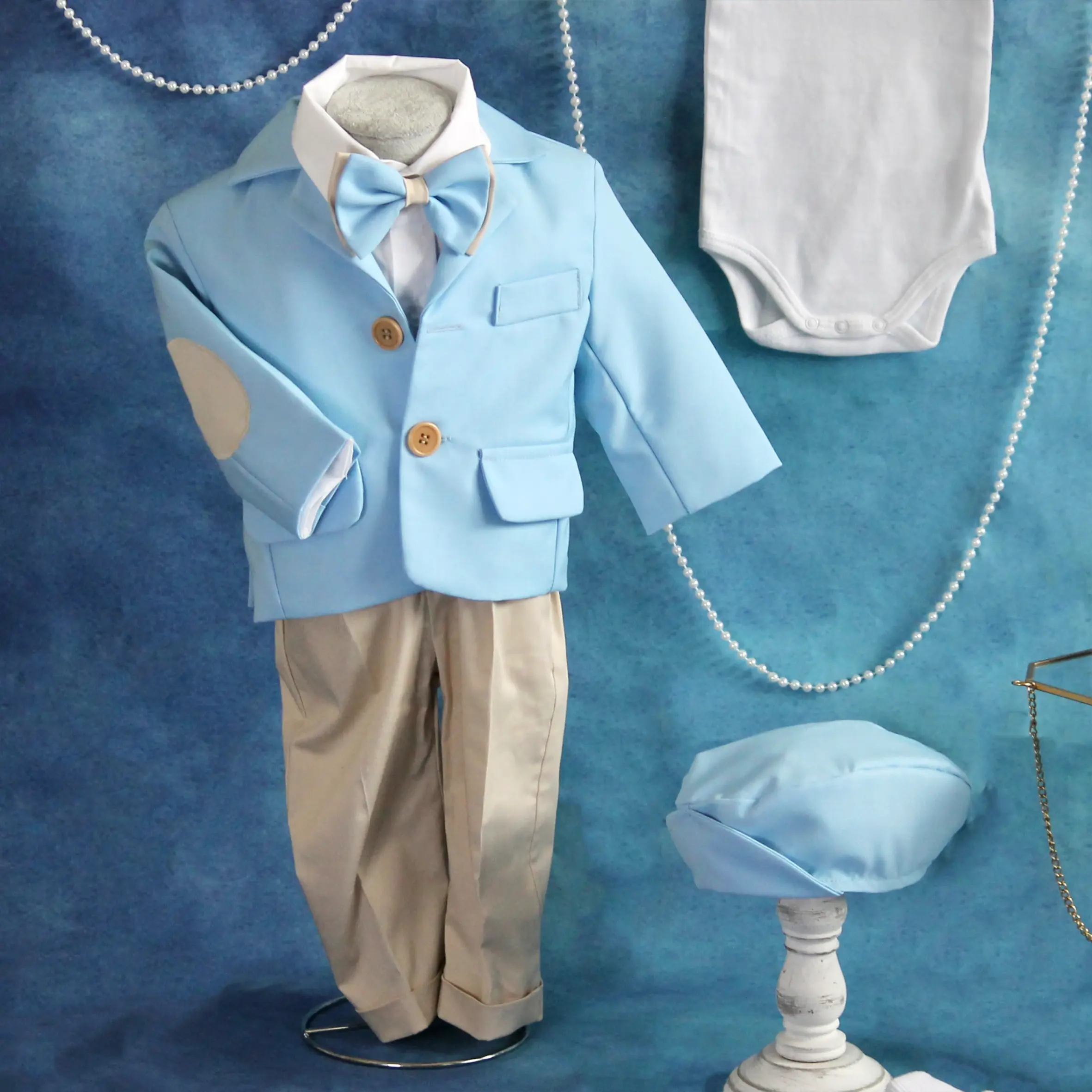 Set complet de botez Gabriel Bleu 16 piese. Costum: sacou, cămașă, pantaloni, șepcuță, papion, botosei, șosete, body. Lumanare și Trusou personalizate.