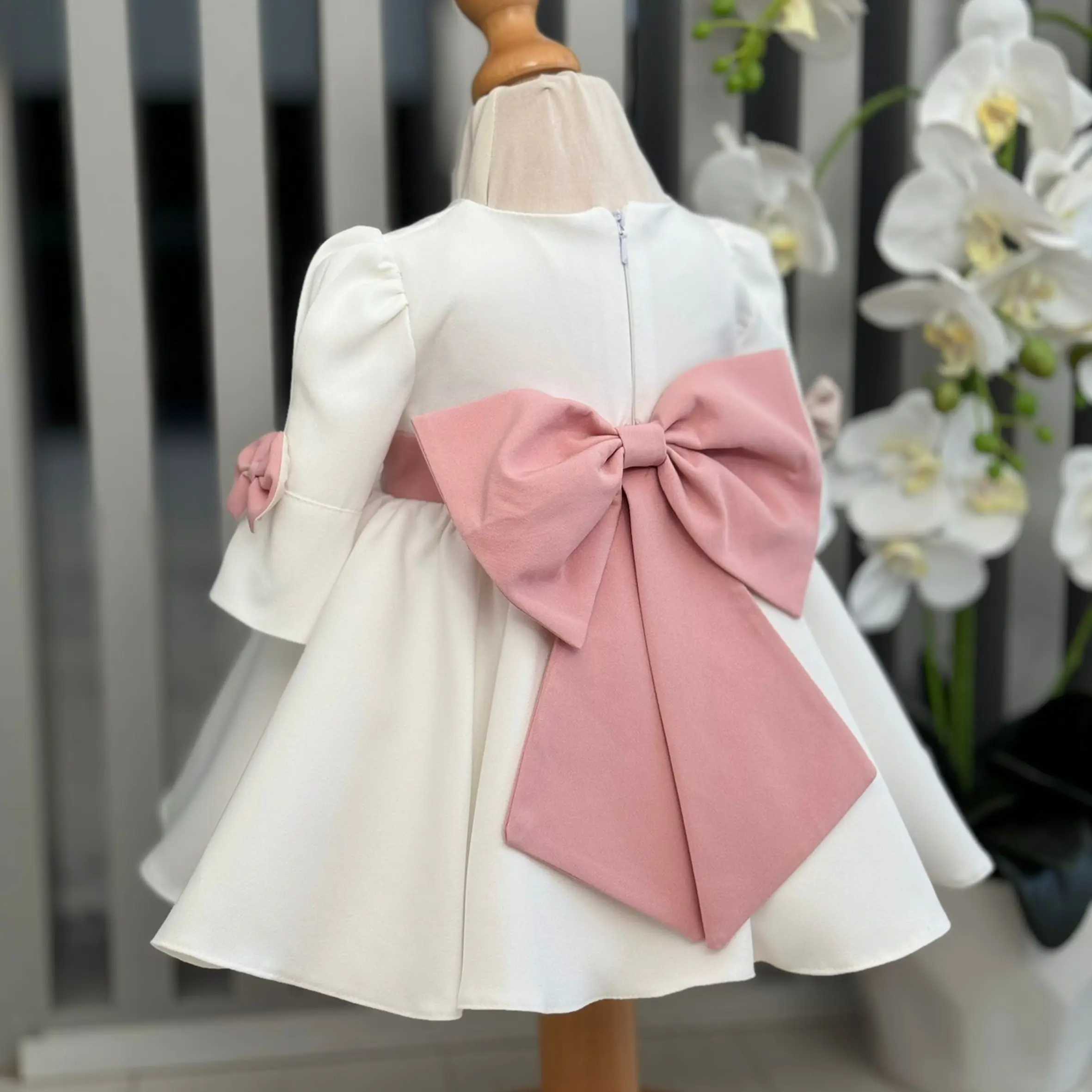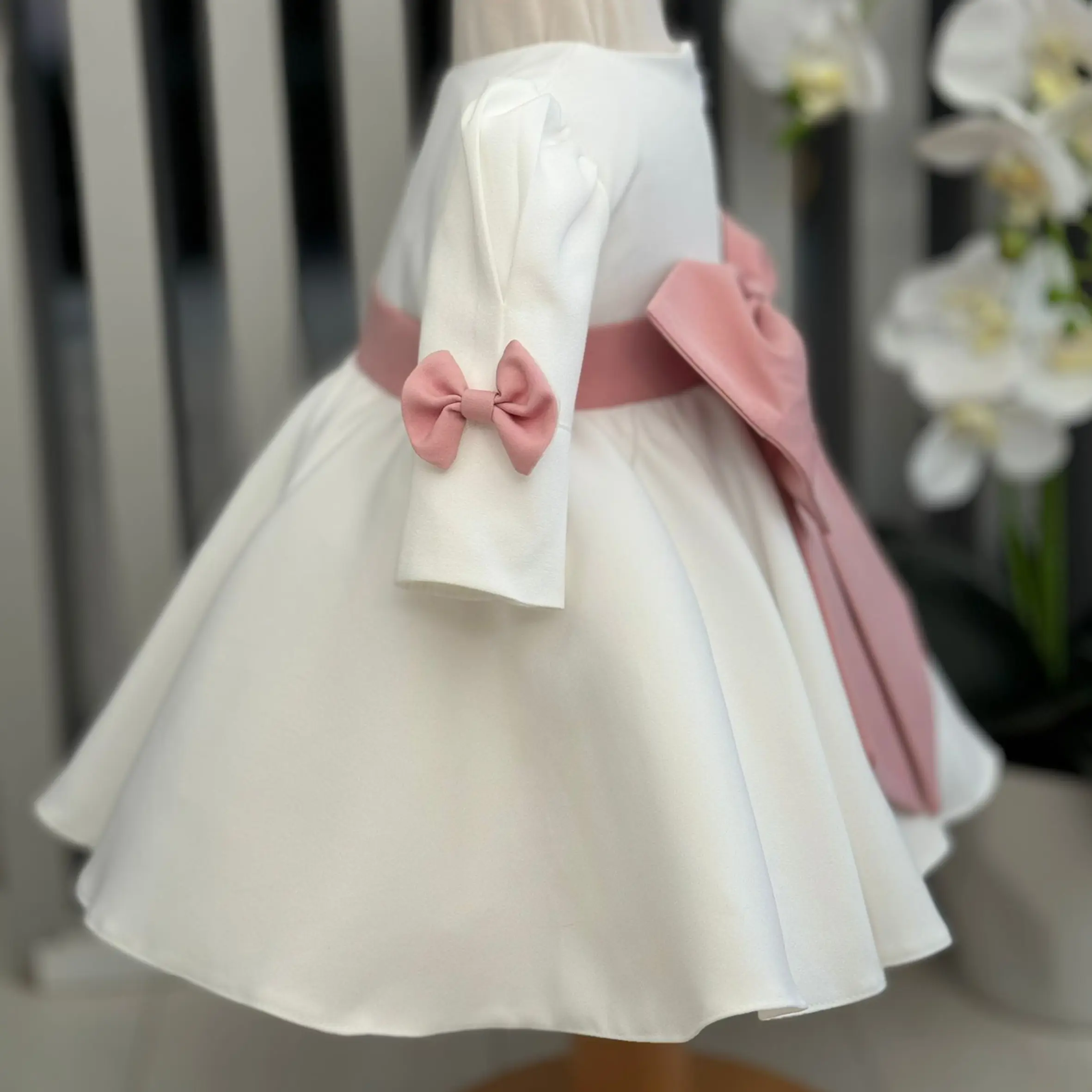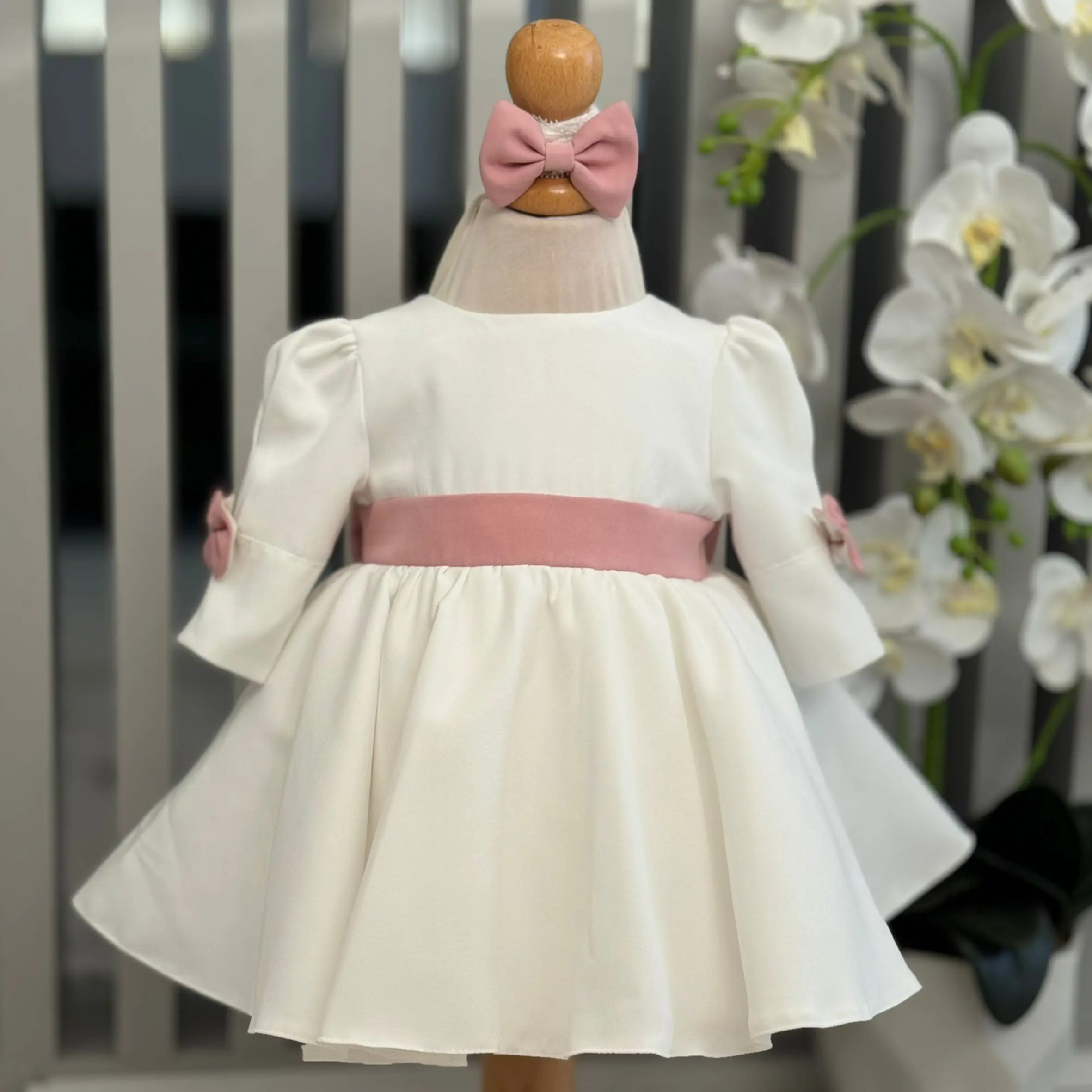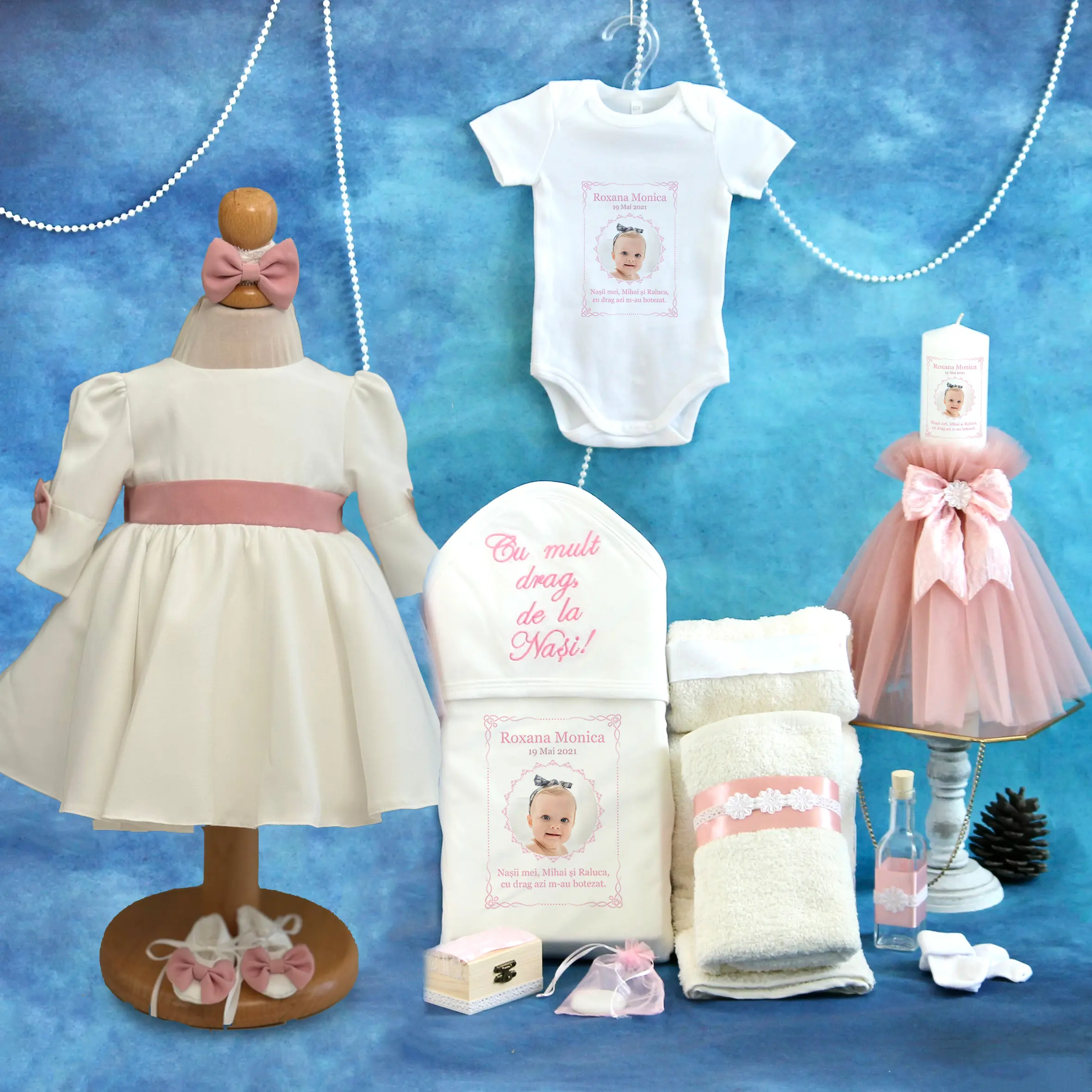 - Rochiță – delicată, din material fin. Accentul rochiței este redat cu ajutorul fundei spectaculoase. Întregul interior al rochiței este confecționat din bumbăcel moale.