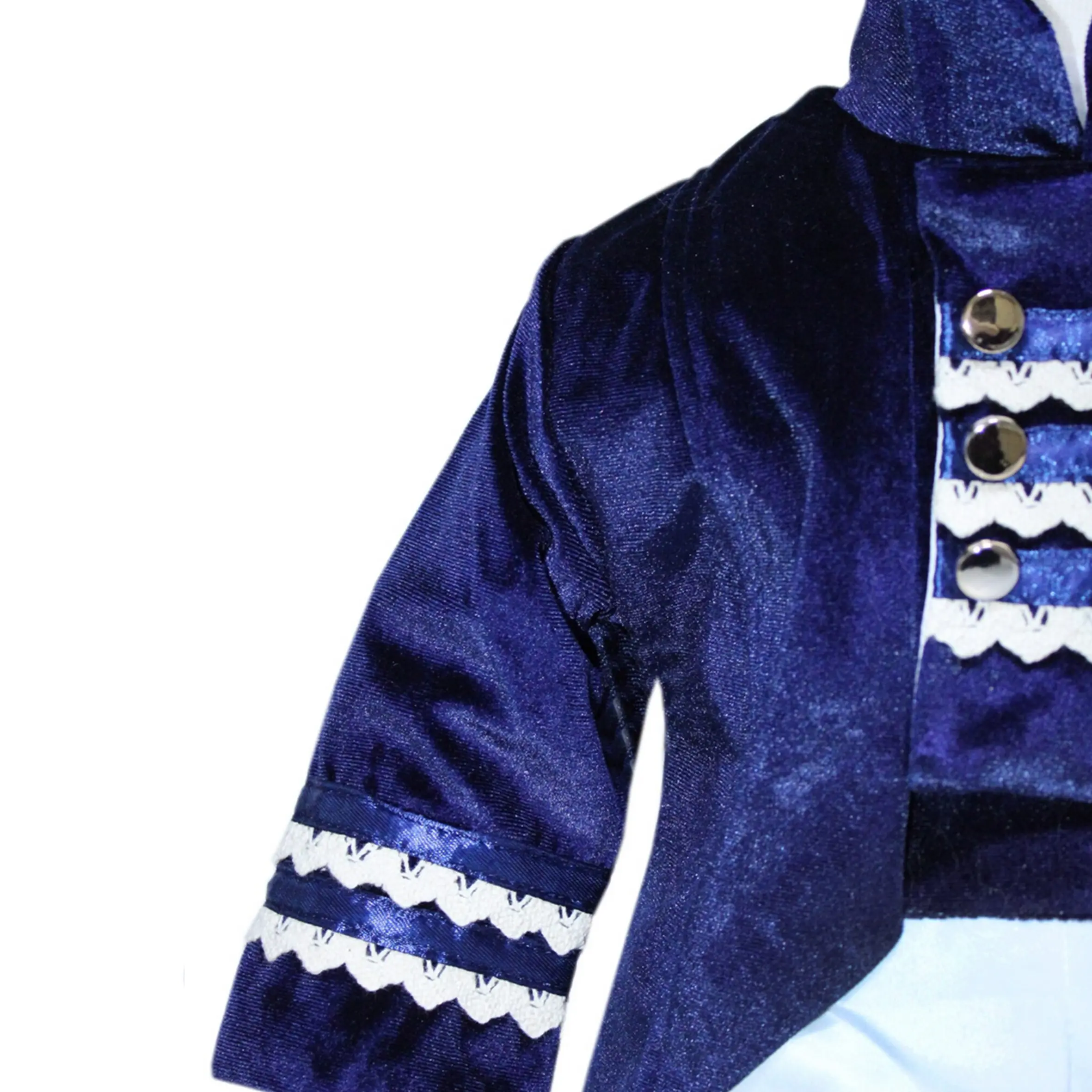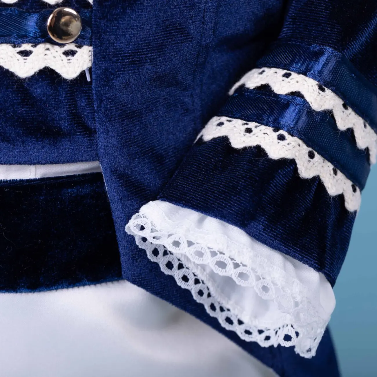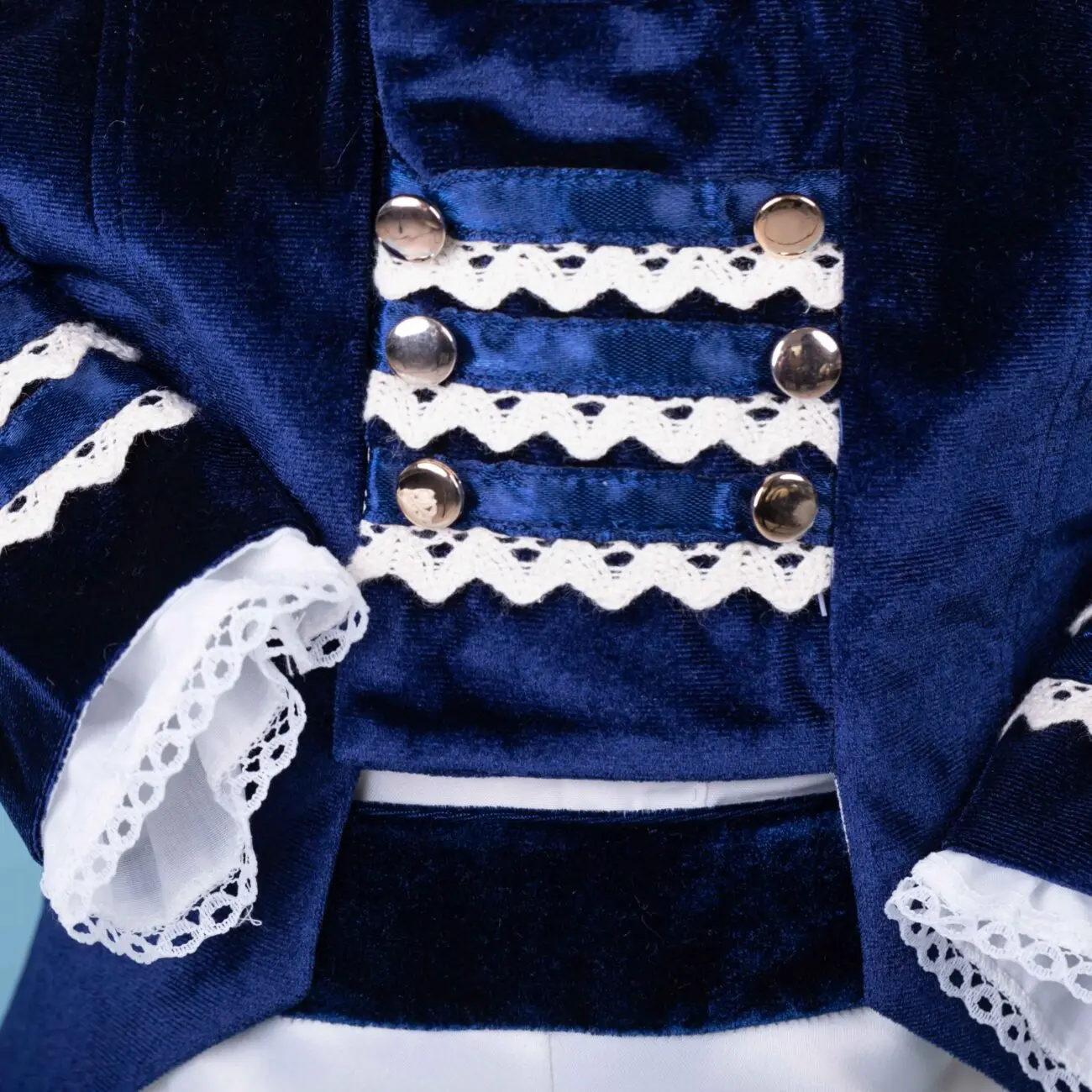 3. Cămașă – este din poplin, alb-ivoire cu mâneci crețe și dantelă, manșetele cămășii se ivesc de sub mânecile catifelate ale redingotei.
