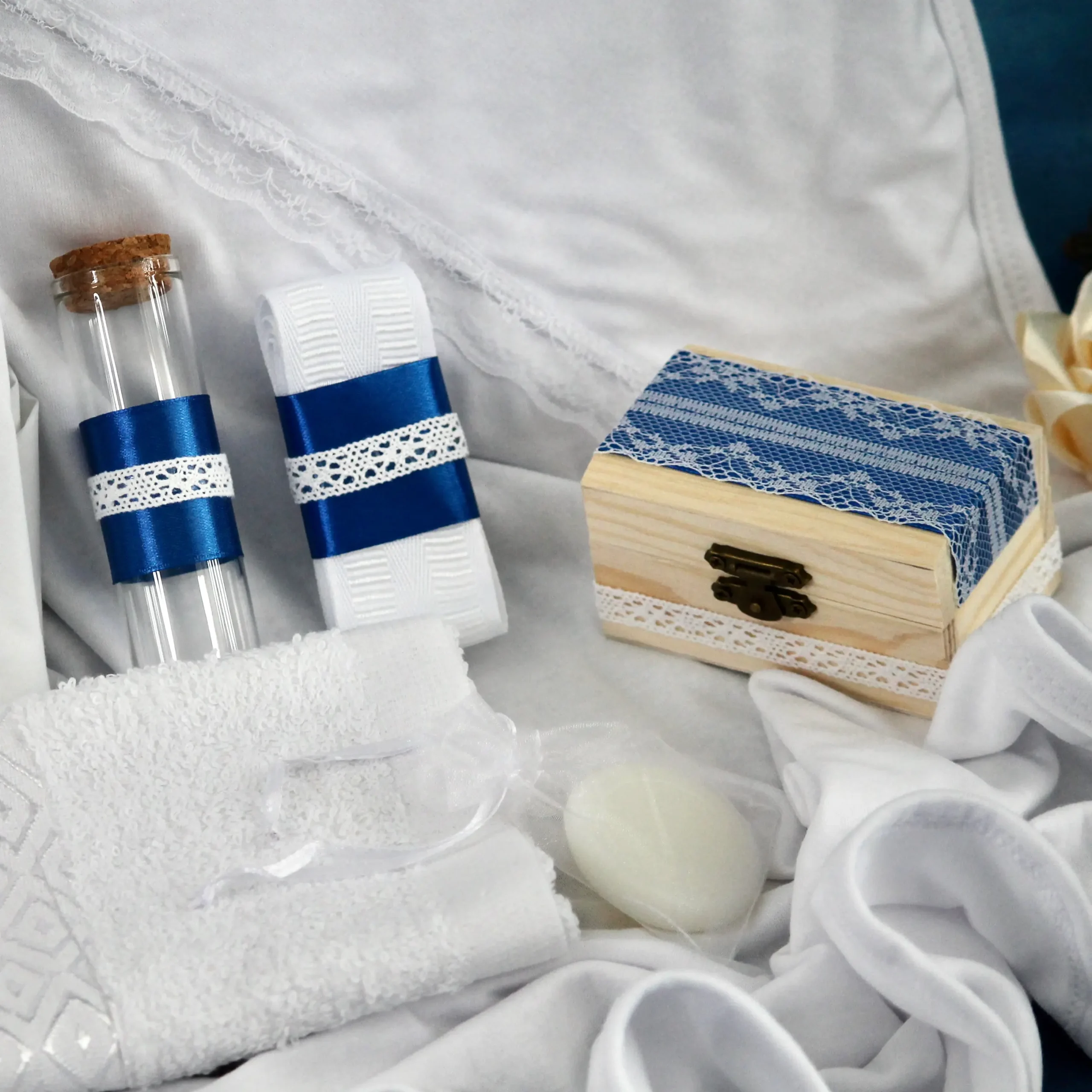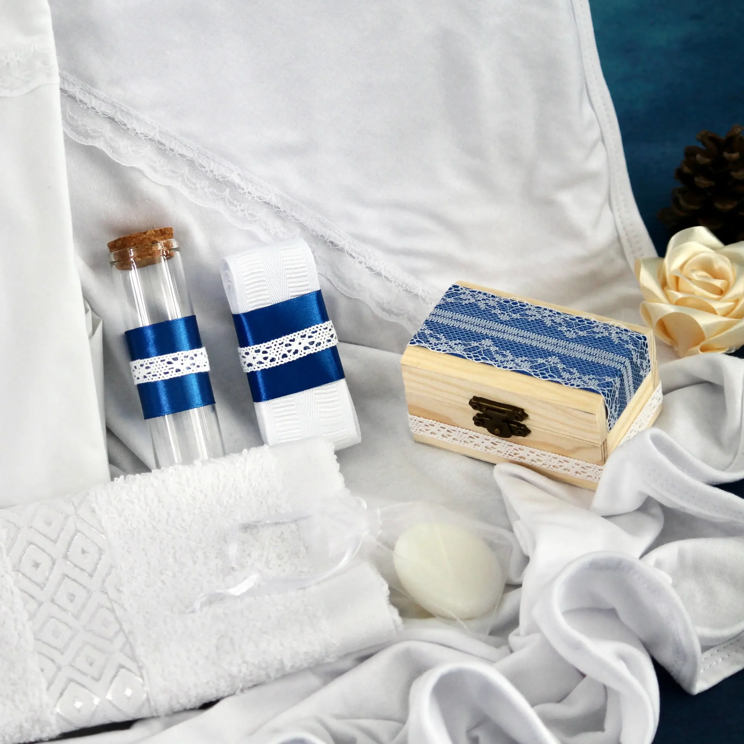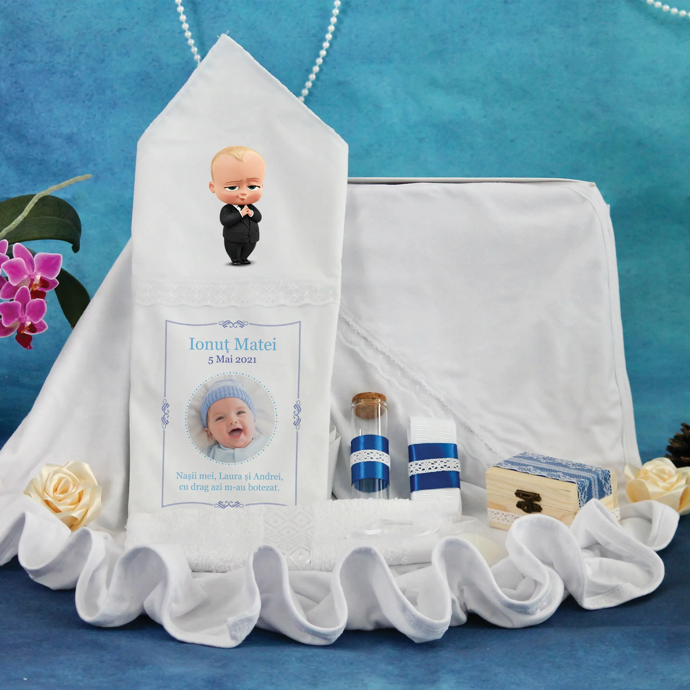 Trusou Botez Albastru Boss Baby din 7 piese – conține tot ceea ce este necesar la biserică pentru săvârșirea Sfintei Taine a Botezului.