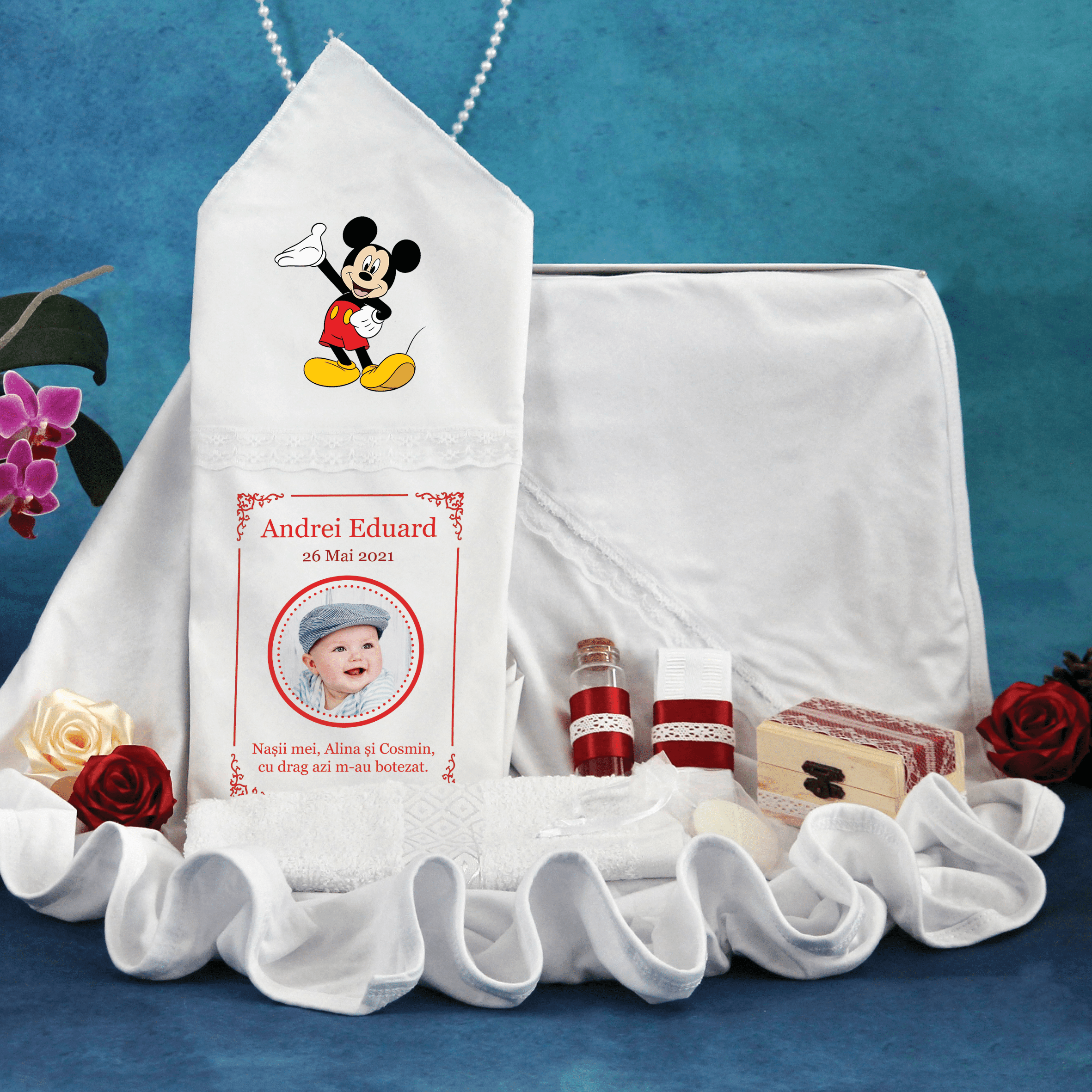 Trusou Botez Roșu Mickey Mouse din 7 piese – conține tot ceea ce este necesar la biserică pentru săvârșirea Sfintei Taine a Botezului.