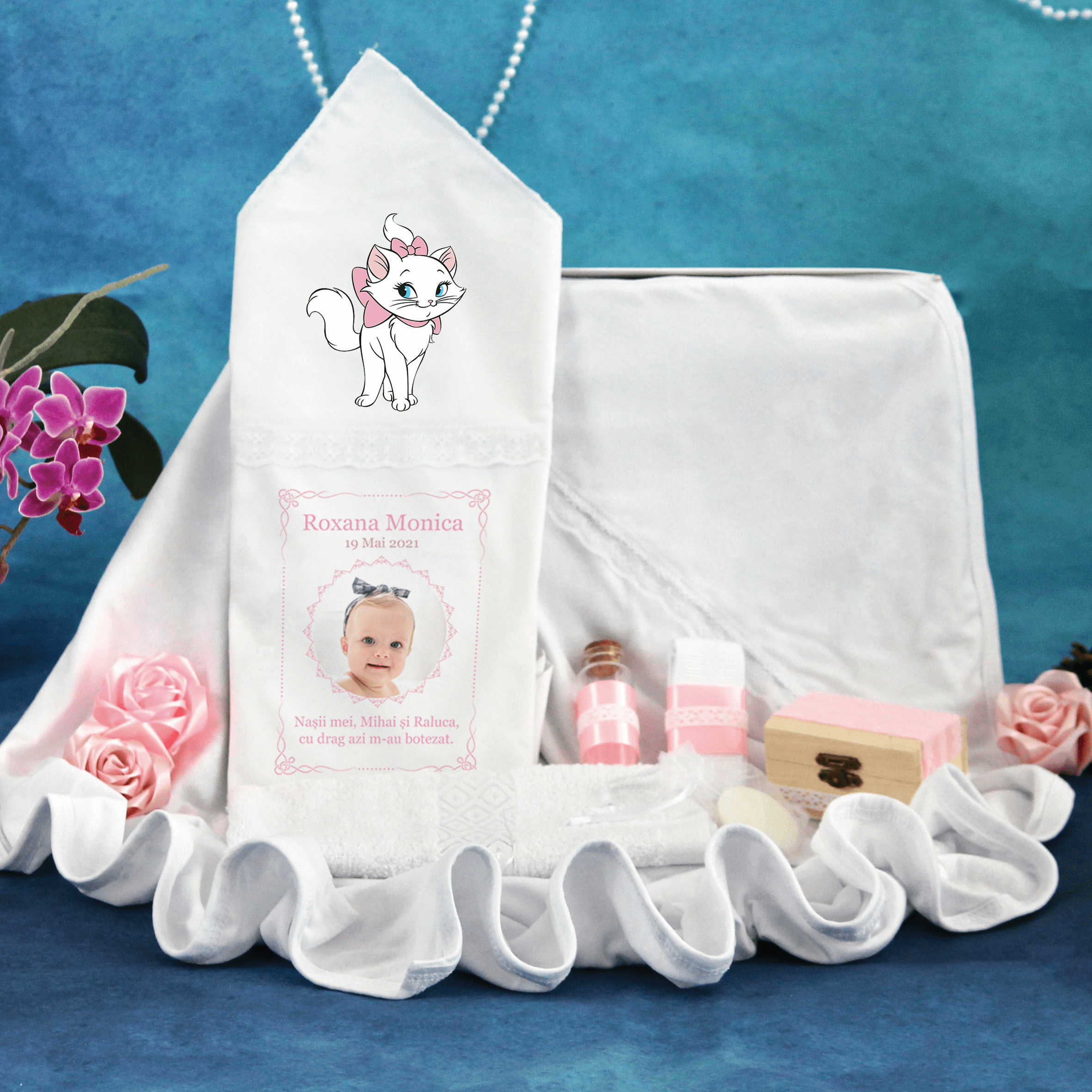 Trusou Botez Roz Marie Pisicile Aristocrate din 7 piese – conține tot ceea ce este necesar la biserică pentru săvârșirea Sfintei Taine a Botezului.